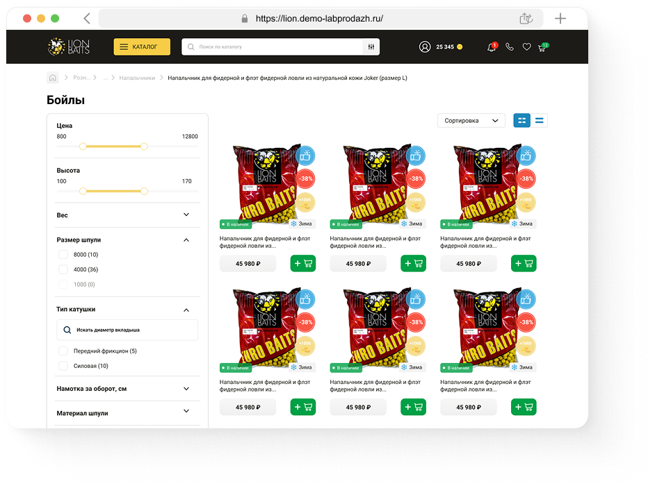 Параллельно с техническими работами мы занимались визуальной и интерфейсной частью сайта. Был разработан современный дизайн, основанный на фирменном стиле бренда LION. Мы уделили особое внимание структуре каталога — пользователю стало проще ориентироваться даже в огромном ассортименте. Карточки товаров получили новый формат: на них размещены подробные характеристики, галерея изображений, отзывы, рекомендации и связанные товары.